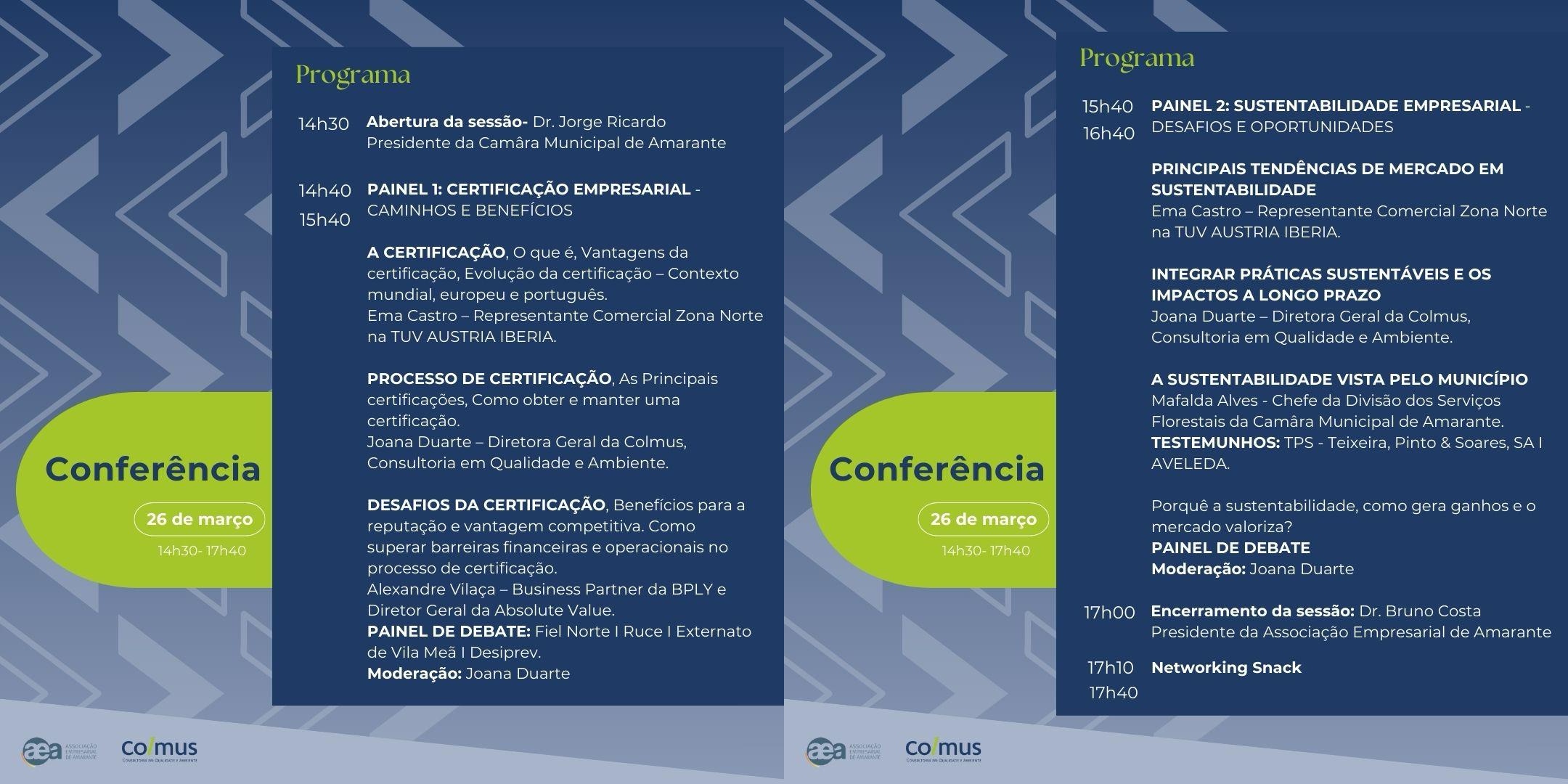 É com grande satisfação que o/a convidamos para a Conferência “Certificação e Sustentabilidade Empresarial”, onde iremos debater os benefícios da certificação, o impacto da sustentabilidade no mercado e as oportunidades que estas práticas oferecem às empresas.